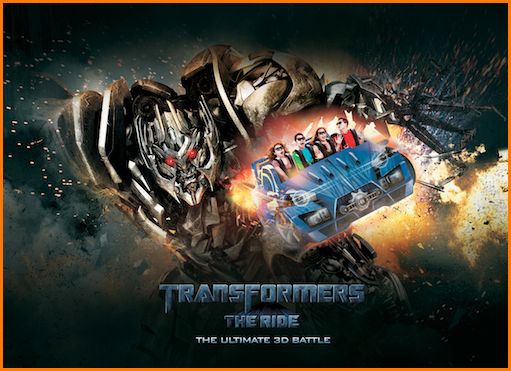 Surprisingly, the highlight of the evening (for us, at least) was not specifically themed for Halloween Horror Nights; it was Transformers: The Ride 3D, in the lower lot, near Evil Dead: Book of the Dead. This combination of ride, motion-simulator, and 3D movie-making is stunning in its ability to create the sensation (partly real but mostly simulated) of moving through a series of different scenes, each one highlighted by some dazzling computer-generated special effects photography, depicting battles between the Autobots and the Decipticons.